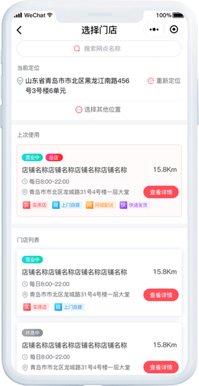 买家:根据所在位置推荐附近门店,门店列表自由切换; 买家也可根据自身需求选择其他区域的门店;