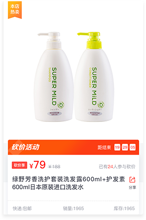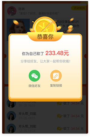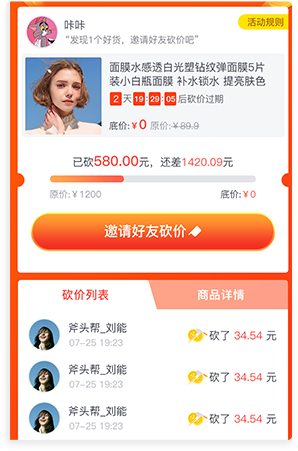 用户通过分享砍掉价格,裂变传播快速推广,达成潜在用户指数级扩散,轻松实现低成本获客。