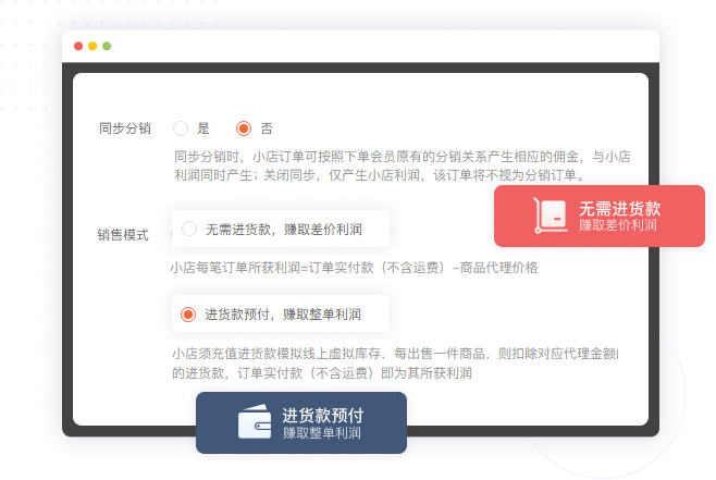 小店须充值进货款模拟线上虚拟库存,每出售一件商品,则扣除对应代理金额的进货款,订单实付款(不含运费)即为其所获利润。